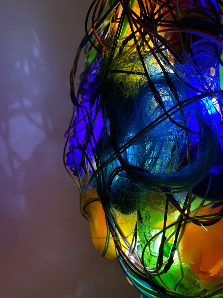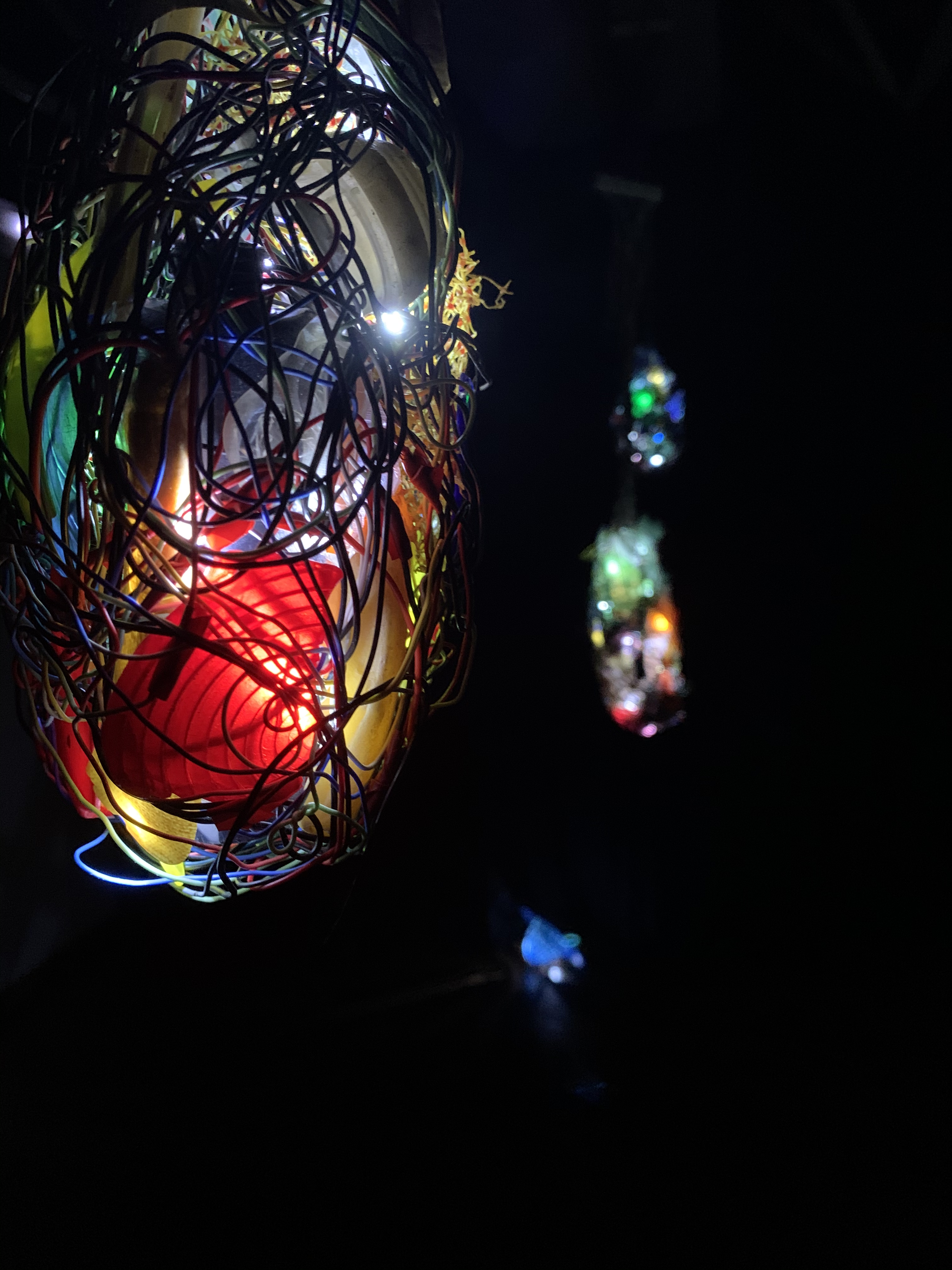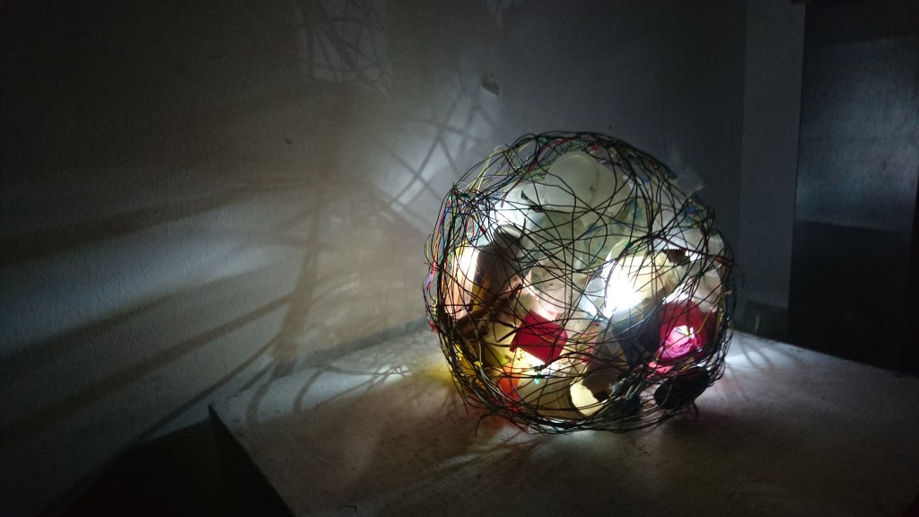 La sala de exposiciones, se presenta en penumbra, alumbrada únicamente por las piezas que se encuentran en ella. Al iluminar las piezas desde su interior, se reflejan los colores que las dominan y destacan en el espacio. Al acercarse, se interactúa con la obra, se descubren los pequeños trozos que las forman, que en un principio no se imaginaban, y se enredan formando parte de un todo.
