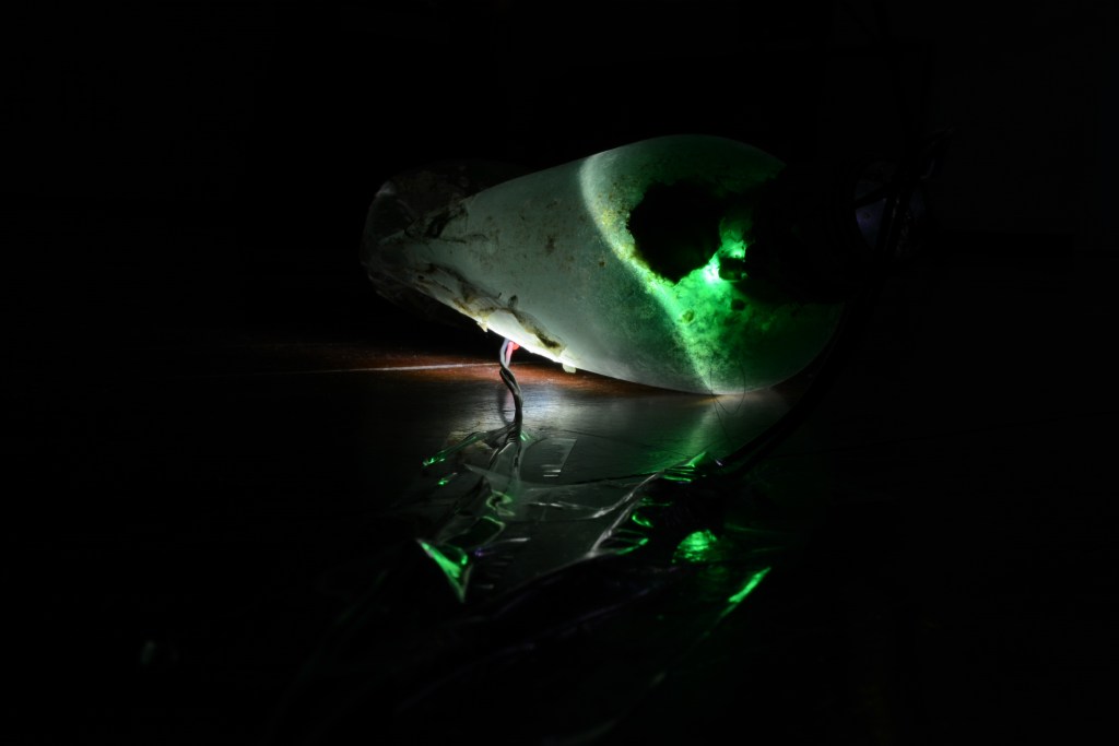 En suelo. Ocupando el lugar, son puntos de luz independientes. Se trata de darle personalidad al residuo, se resaltan sus características. Se enseña lo que es, y lo que ha sido, se observa la belleza de cada elemento, mostrándolo sin transformaciones.